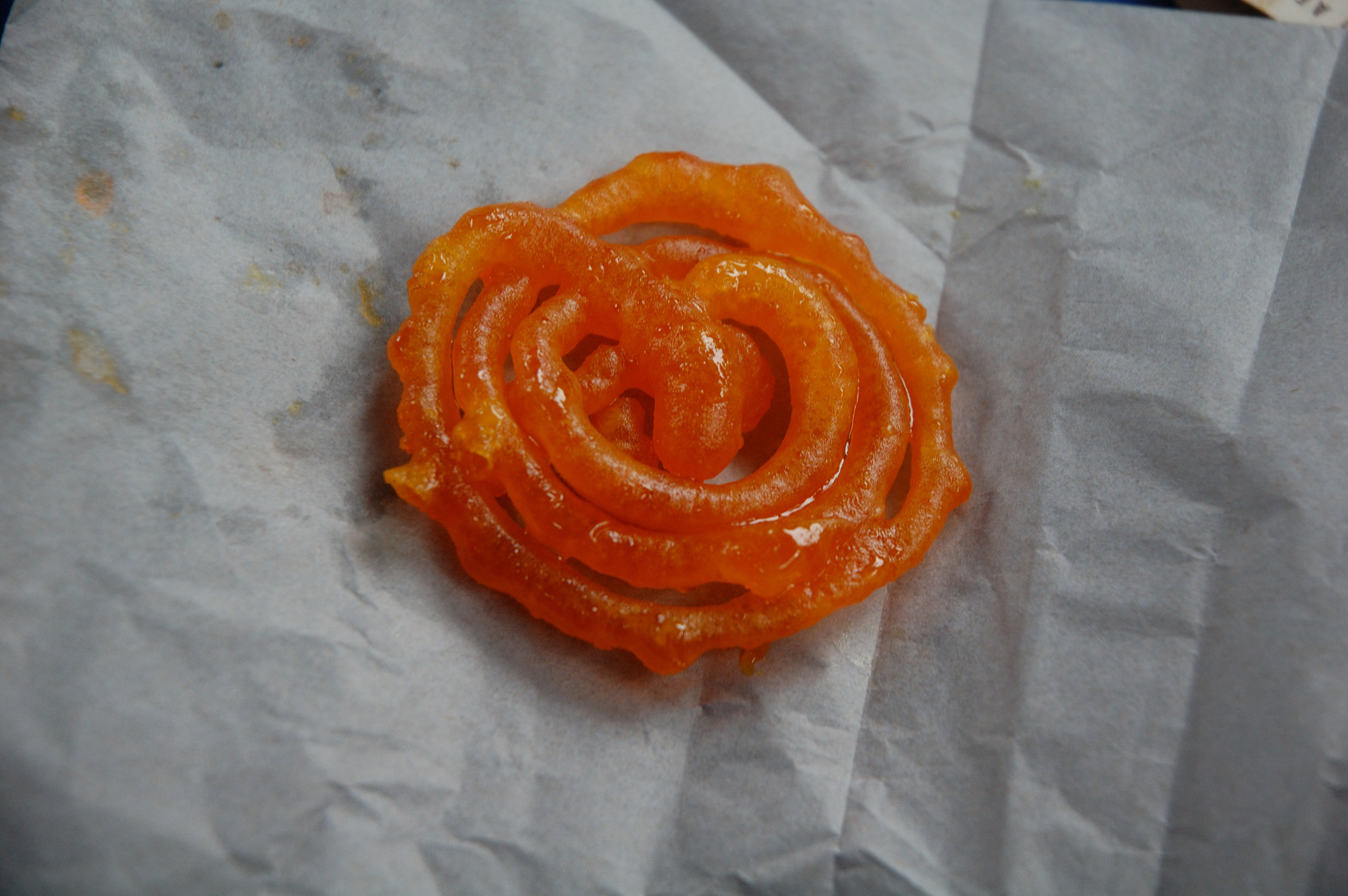 Cape Town’s V&A Food Market let me indulge my Asian food obsession. I tried a bunch of Chinese dumplings: bao (a flour-like dumpling with a chicken filling), a crystal pyramid (a rice noodle outside with pork and vegetables inside), and pork gyoza. I was attracted to an Indian stand where I first discovered jalebi. Jalebi looks like a mini funnel cake coated in sweet and sour sauce and, to some extent, it is. The batter is made from flour and sour curd; it is piped into hot oil (just as funnel cakes are), then dipped in sugar syrup. Mine was cold, but jalebi can also be served warm. The texture is somewhere between crunchy and chewy, and is a bright, red-orange color.